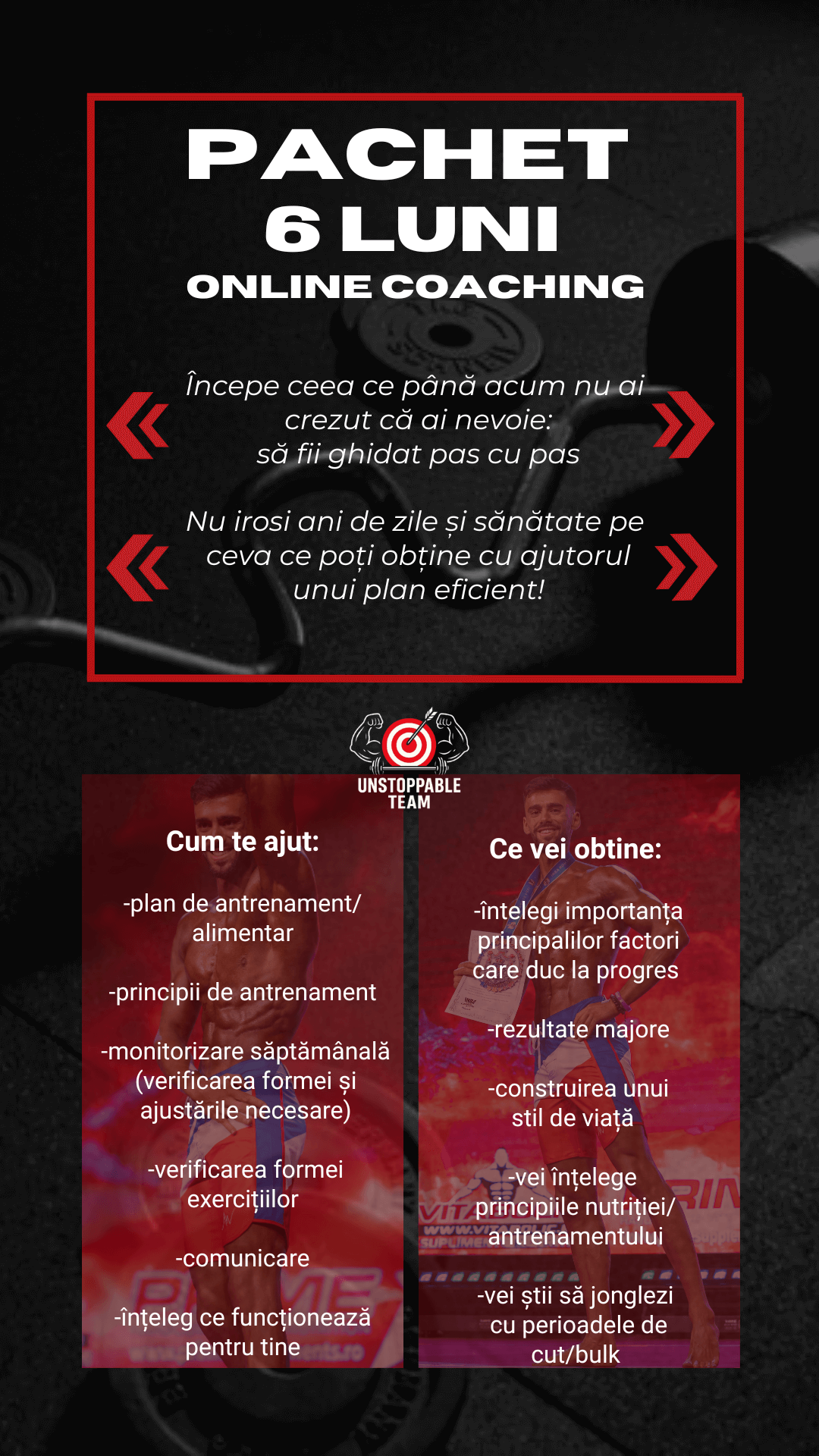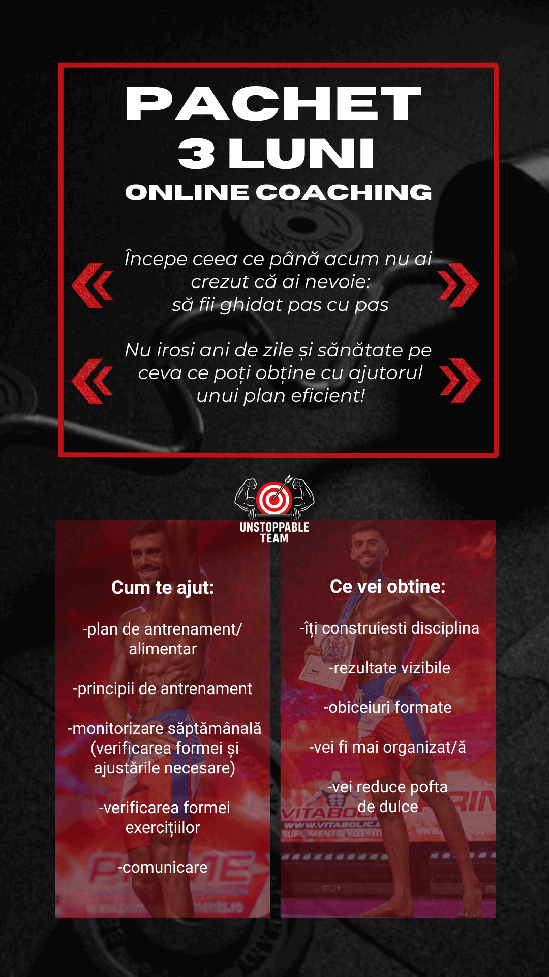 Indiferent dacă vrei să urci pe scenă și să te pregătești pentru competiții de Fitness sau îți dorești doar să îți transformi stilul de viață, să slăbești sau să îți tonifiezi corpul, Unstoppable Team este alături de tine.